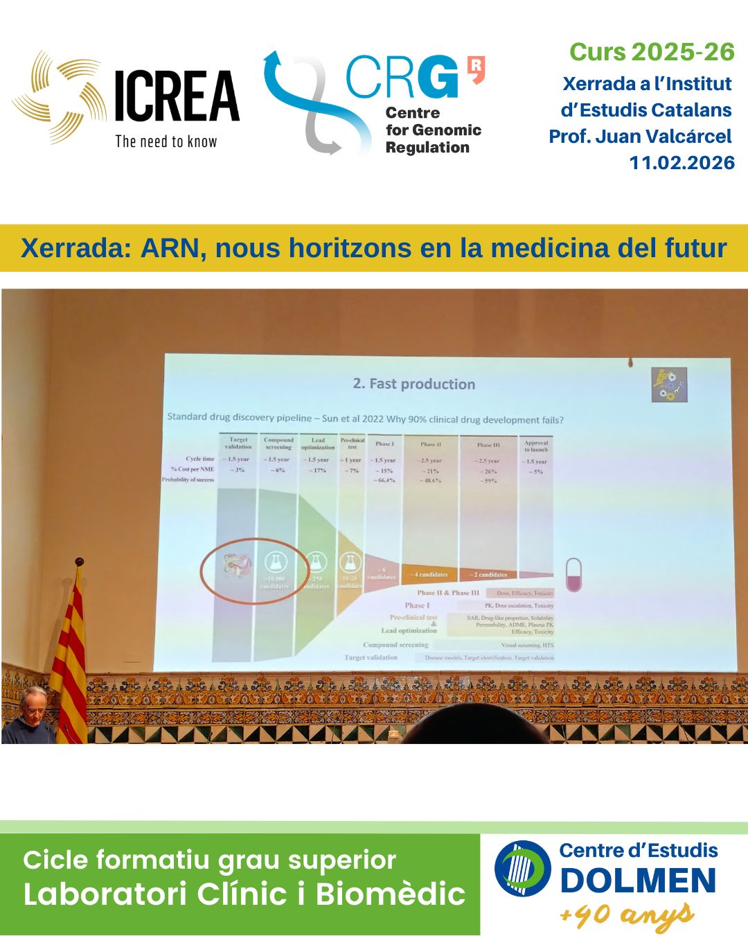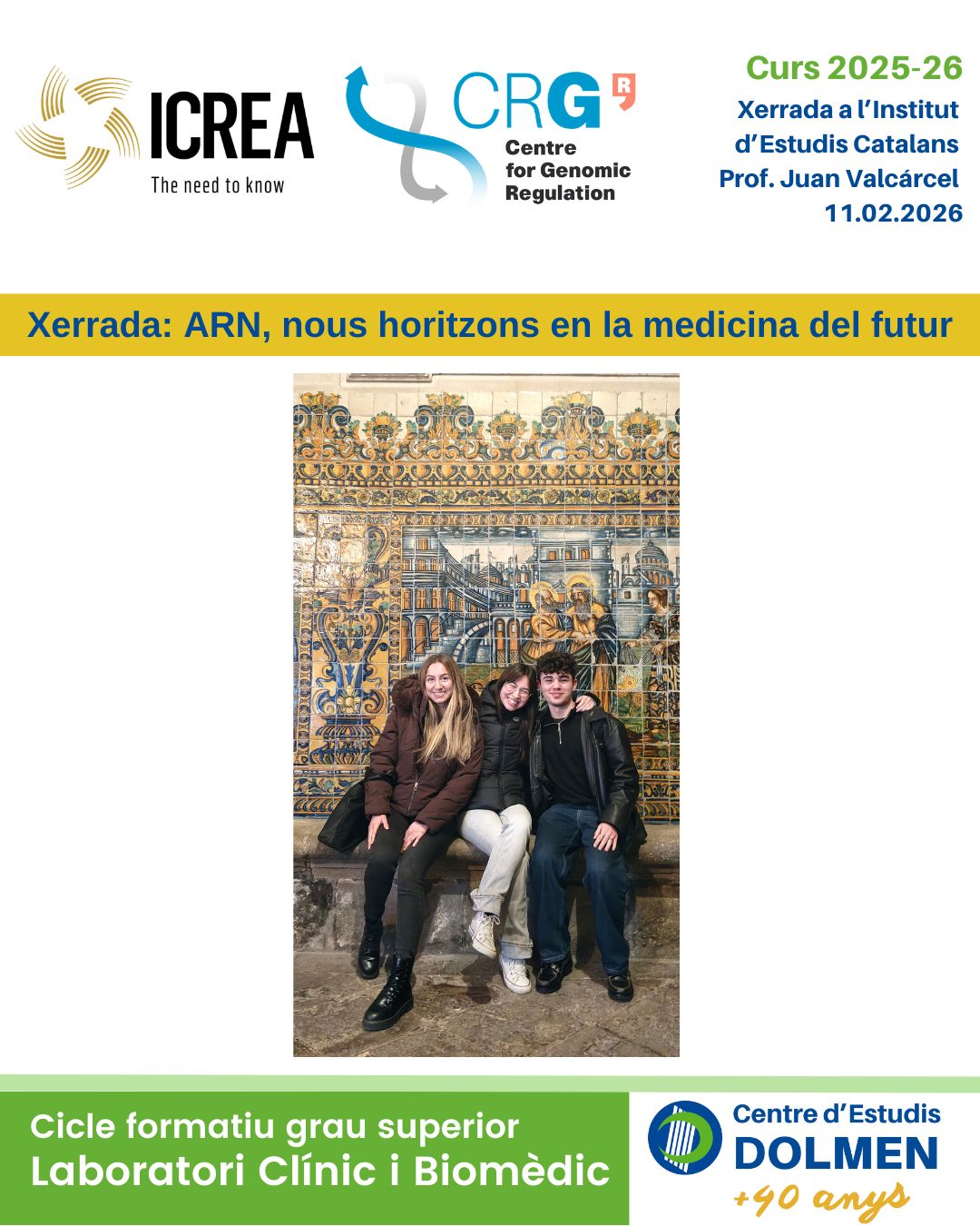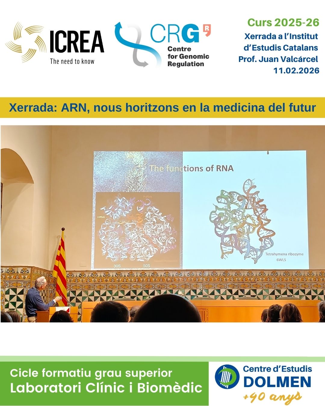 11.02.2026. L’alumnat de 2n de CFGS de Laboratori Clínic i Biomèdic de CE Dolmen va anar a la xerrada a càrrec de Juan Valcàrcel, professor a ICREA – Institució Catalana de Recerca i Estudis Avançats i cap de grup del FUNDACIO PRIVADA CENTRE DE REGULACIO GENOMICA (CRG) que va tenir lloc a l’ Institut d’Estudis Catalans (IEC) i que va estar organitzada per la Secció d’Ensenyament Societat Catalana de Biologia (SCB).