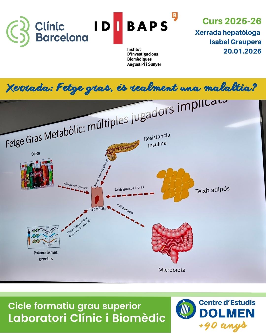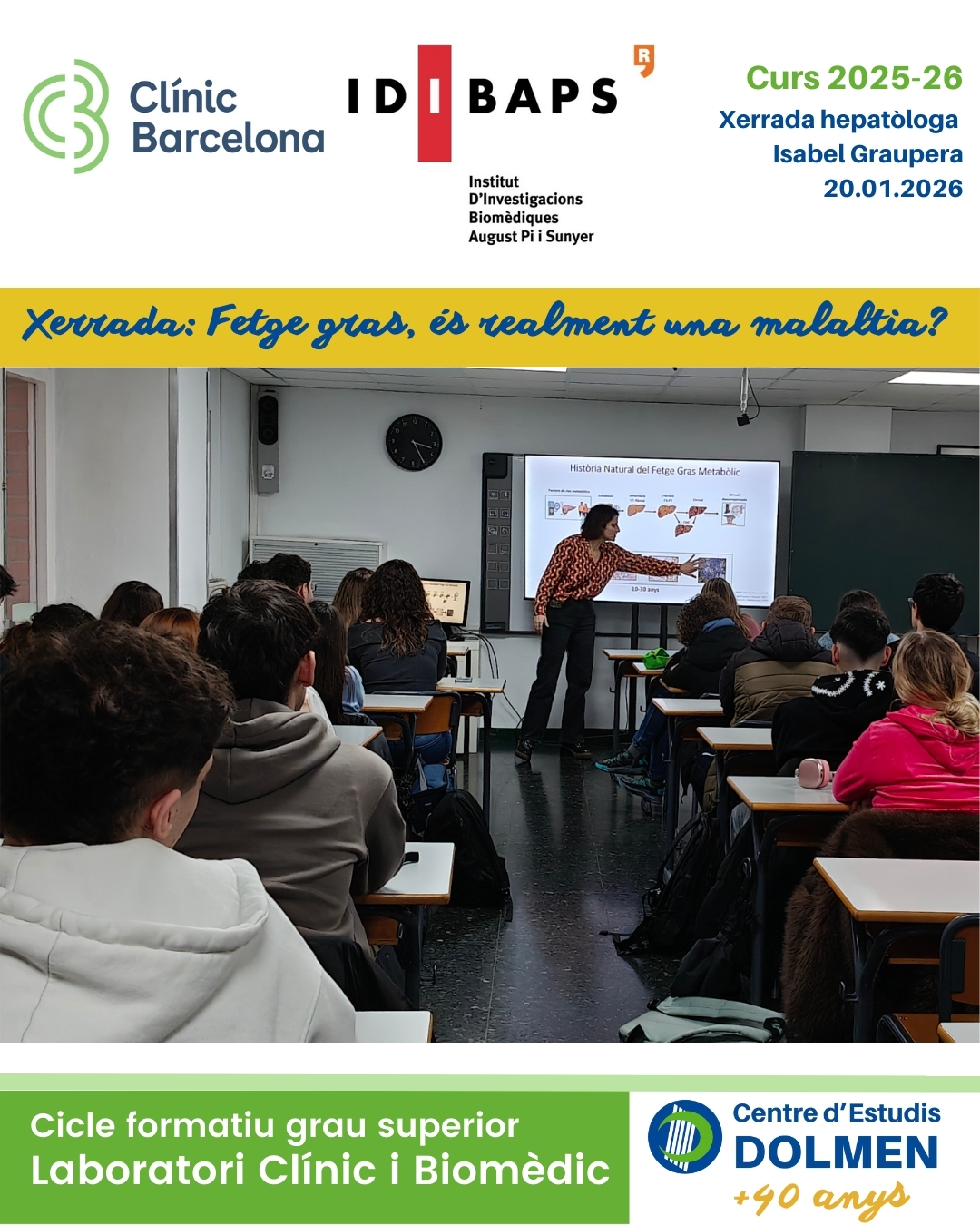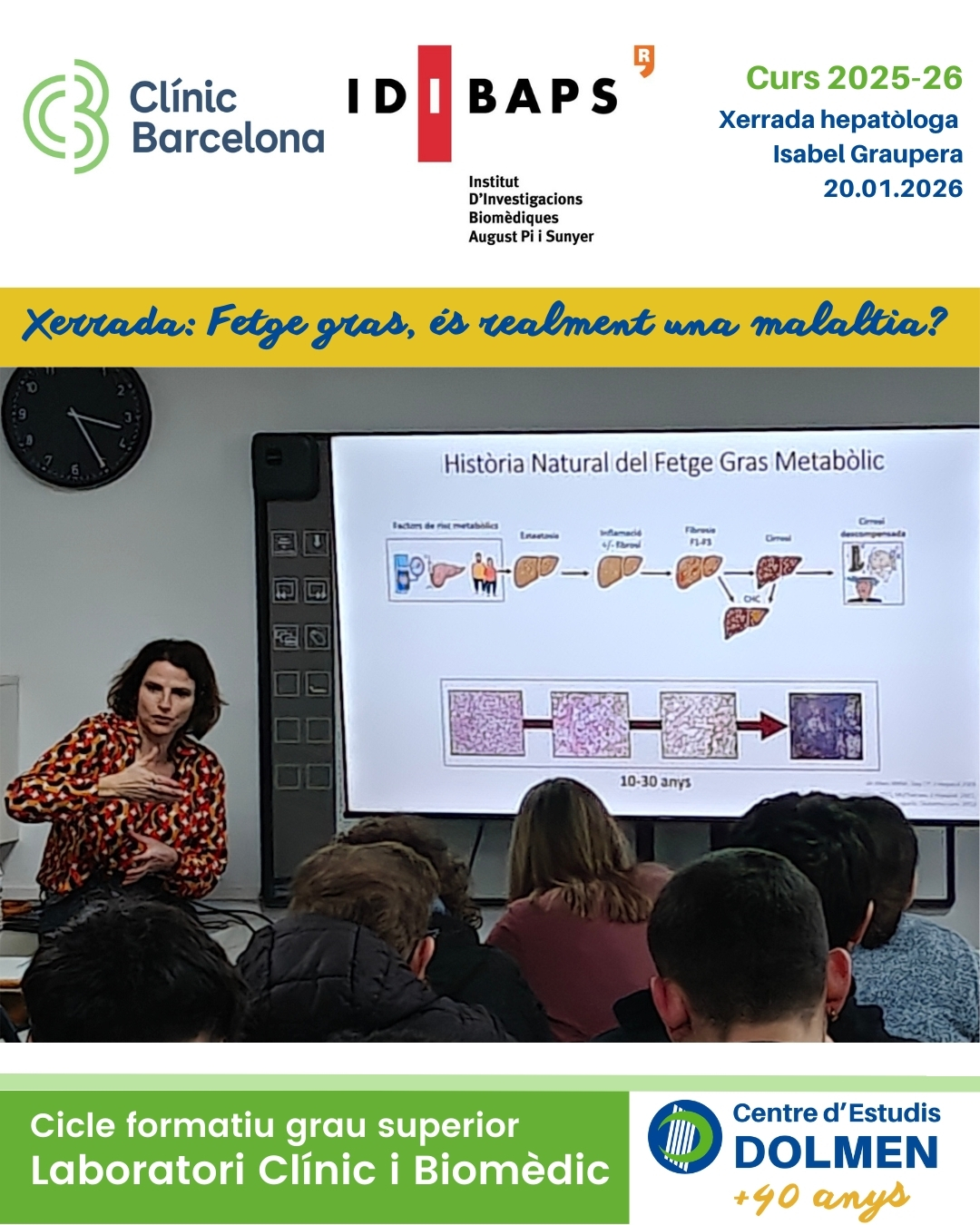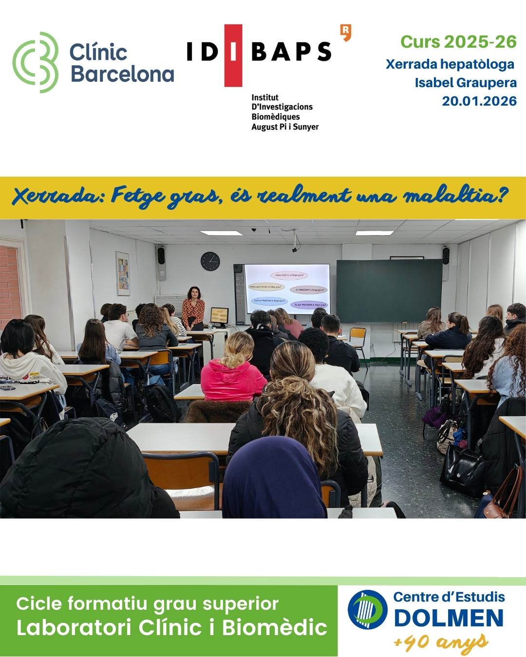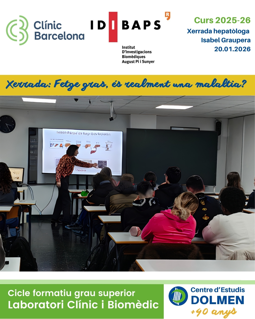 El dimarts 20 de gener ens va visitar a CE DOLMEN l’hepatòloga sènior de l’Institut d’Investigacions Biomèdiques August Pi i Sunyer (IDIBAPS) de l’Hospital Clínic de Barcelona, Isabel Graupera. Va dirigir la xerrada divulgativa “Fetge gras, és realment una malaltia?” a l’alumnat de primer i segon del cicle formatiu de grau superior de Laboratori Clínic i Biomèdic.